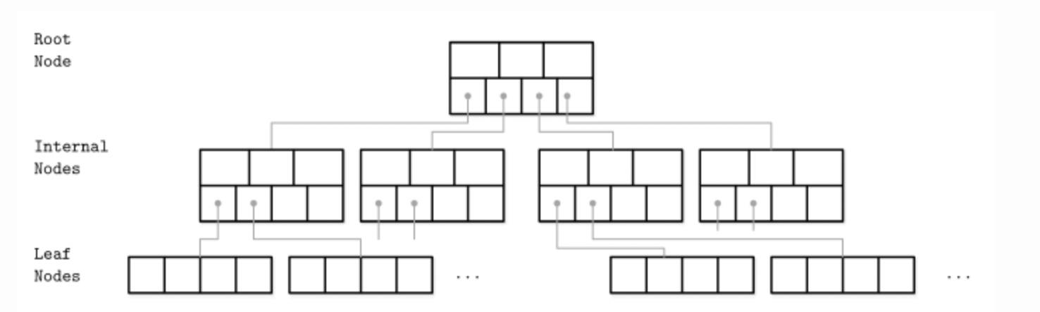 Each node in a B+ Tree can store hundreds of keys (depending on the row and page size). This means the tree remains very shallow, even with millions of rows, usually just 3 to 4 levels deep. Fewer levels = fewer disk reads during lookups.