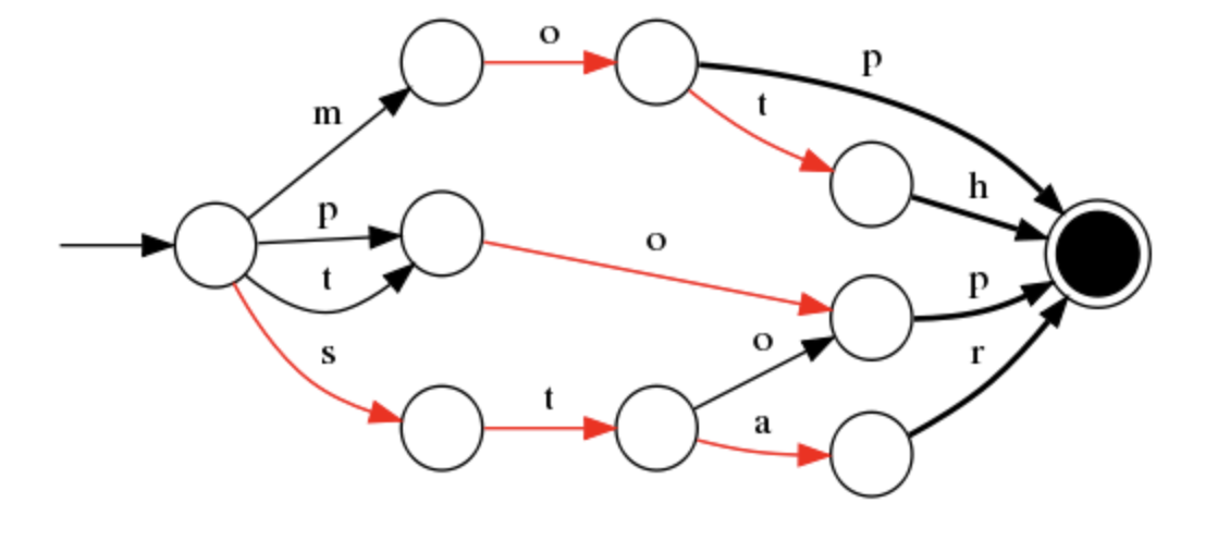 Lucene addresses this problem with FSTs, which can be thought of as a prefix-compressed trie with additional metadata. Refer to the image given below to get a high-level idea of how it looks.