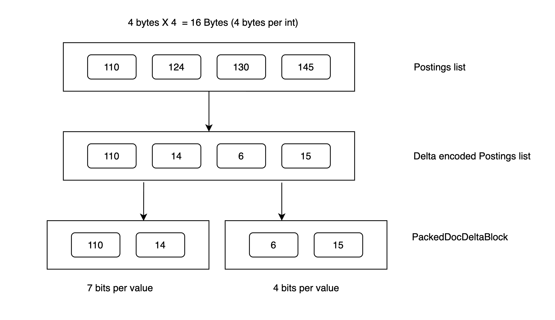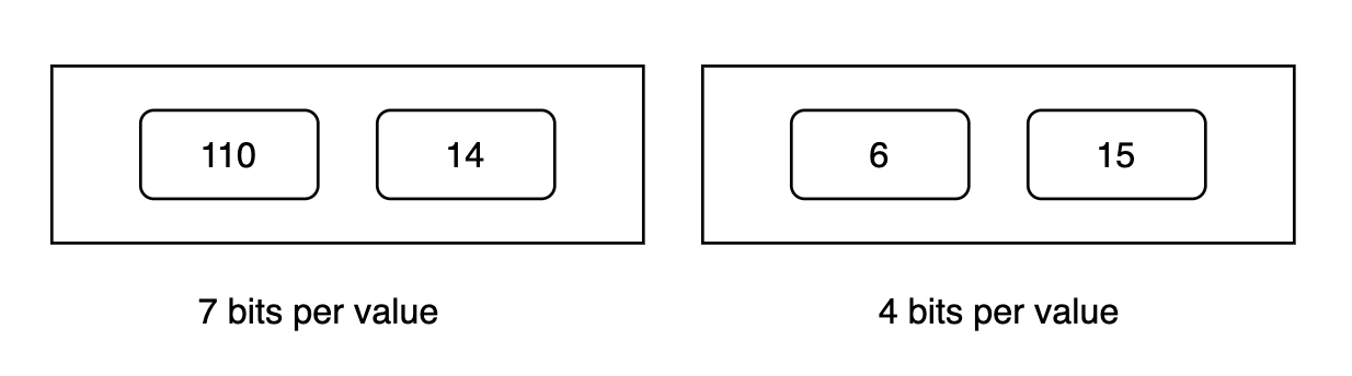 This reduces the original 16 bytes to around 5 bytes (7 bits * 2 + 4 bits * 2 = 22 bits = 2.75 bytes + 1 byte in each block for the header = 5 bytes) in this example, which is a huge saving at scale.