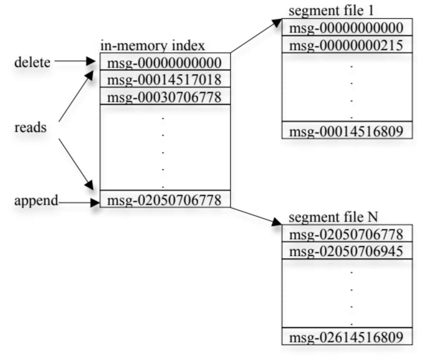 Each partition is divided into multiple files of almost the same size. New messages are appended to the current file. These messages are buffered in memory and are flushed in batches for better efficiency.
